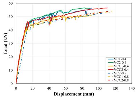 The load - displacement curves of beams are presented in Figure 3. Table 3 shows the yielding load ( P 푦 ) and corresponding yielding displacement ( ∆ 푦 ), the maximum load ( P 푚2 ) and corresponding displacement ( ∆ 푚2 ) of beams. Yielding loads were determined using the strains measured with the strain-gages. Initial yielding stiffness ( K 푦 ) and displacement ductilities (휇) of beam are presented in Table 3. Initial yielding stiffness was calculated using the yielding load. Displacement ductility was calculated as the ratio between the maximum displacement and the yielding displacement of corresponding beams. For beam VCC1-08, only the maximum load and corresponding displacement are presented because of problems with the measurements with the strain-gages.