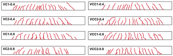 A Figura 2 mostra o padrão de fissuração final das vigas. O padrão de fissuração foi semelhante tanto para as vigas de controle quanto para as vigas corroídas. Este padrão foi caracterizado pela formação de fissuras de flexão verticais na parte central das vigas e fissuras de flexão-cisalhamento inclinadas nas extremidades.