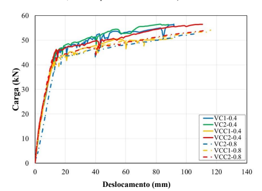 A Figura 3 mostra as curvas carga-deslocamento das vigas. A Tabela 3 mostra a carga de escoamento ( 푃 푦 ) e o deslocamento de escoamento correspondente ( ∆ 푦 ), bem como a carga máxima ( 푃 푚2 ) e o deslocamento máximo correspondente ( ∆ 푚2 ) das vigas. As cargas de escoamento foram determinadas usando as deformações unitárias medidas com os strain gages das vigas. A Tabela 3 inclui a rigidez de fluência inicial ( 퐾 푦 ) e a ductilidade de deslocamento (휇) das vigas. A rigidez de escoamento inicial foi calculada usando a carga de escoamento. A ductilidade de deslocamento foi calculada como a razão entre o deslocamento máximo e o deslocamento de escoamento correspondente de cada viga. Para a viga VCC1-0,8, apenas a carga máxima e seu deslocamento correspondente são relatados, devido a problemas com as medições do extensômetro.