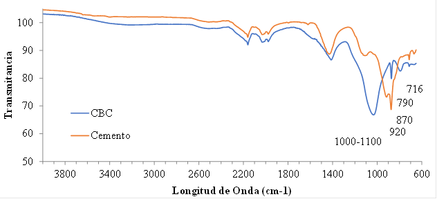 La técnica de FTIR permite realizar el análisis cualitativo de muestras orgánicas e inorgánicas, empleándose en ensayos de control de calidad y/o necesidades de investigación. La figura 5 muestra el espectro FTIR de la ceniza de bagazo de caña (CBC) y cemento portland. El análisis se realizó en el infrarrojo medio en la zona vibracional de 4000 a 600 cm-1.