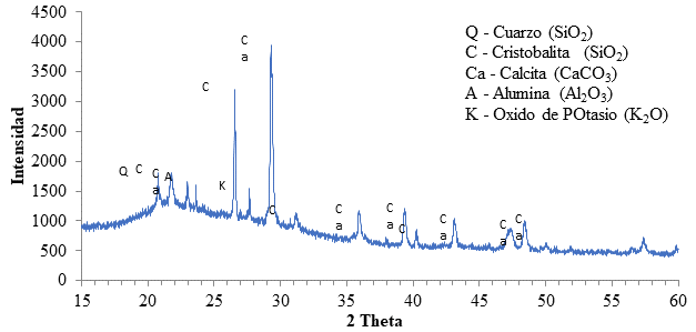 La composición mineralógica de la CBC fue determinada por la técnica de Difracción de Rayos X (DRX), mediante un equipo marca BRUKER, con una velocidad de escaneo de 5°/min y paso de 0.020 grados. En la figura 6 se muestra el espectro de DRX, donde se puede observar que la CBC presenta características amorfas debido al levantamiento de la línea base entre 15 y 35 (2(); Dicha comportamiento significó que la CBC puede presentar cierta actividad puzolánica reducida, pudiendo emplearse en cierta medida como material adicional al cemento portland (Martirena, et al., 1998).