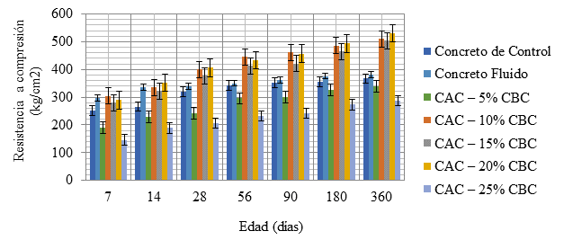 En la figura 7 y en la tabla 9, se muestran los resultados de resistencia a compresión a los 7, 14, 28, 56, 90, 180 y 360 días para todas las mezclas, donde se puede observar que la resistencia a compresión de las mezclas con 10%, 15% y 20% de CBC obtuvieron resistencias superiores a la mezcla de control y fluida, aunque el uso de materiales con características puzolánicas puede generar una disminución de la resistencia en los primeros 28 días (López, et al., 2010); sin embargo, si se garantiza la humedad y condiciones debidas para propiciar las reacciones de hidratación del cemento y las reacciones puzolánicas de la CBC (Neville y Brooks, 1998), la resistencia del concreto con CBC podría ser superior que un concreto sin CBC a edades superiores de los 28 días. Mediante las mezclas que se elaboraron para este estudio fue posible constatar el efecto de la ganancia de resistencias después de los 28 días, siendo más altas en las mezclas de CAC con CBC de 10%, 15% y 20%, pudiendo evidenciar el efecto puzolánico reducido de la ceniza. Para las mezclas con 5% y 25% de CBC no se presentó el mismo efecto, lo que se relaciona con la pérdida de la capacidad puzolánica de la CBC.