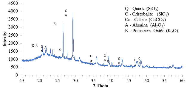 On the FTIR spectrum of the CBC shown on figure 5 it can be seen a strip on 1108 cm-1, corresponding to the Silica (O-Si-O) (Sócrates, 2004). Meanwhile that in regions close to 1042 cm-1 there were detected signals corresponding to Si-O (Castaldelli, et al., 2016) and on the wavelengths of 1472 and 870 cm-1 it was related with the presence of carbonates (O-C-O) (Castaldelli, et al., 2016). Likewise, for the value of 870 was associated with the presence of SiOH, and at 716 cm-1 for K2O (Castaldelli, et al., 2016). Using this technique, it was possible to get an approach to the chemical composition of the sugarcane bagasse ash, showing it is mainly compounded of SiO2 and carbonates, which allowed an analysis using the XRD technique.