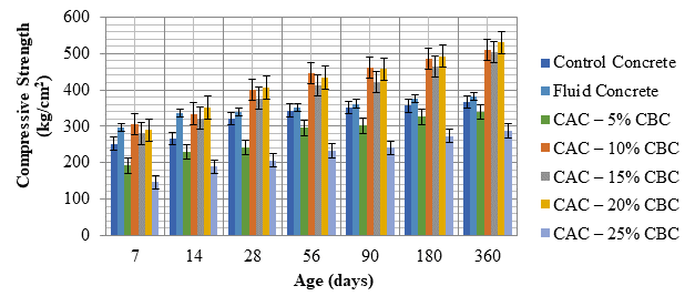 In the V funnel test, is acceptable a time from 6 to 12 seconds, allowing an evaluation of the filling capacity of the mixtures. Where the concrete mixtures CAC-10%CBC, CAC-15%CBC and CAC-20%CBC were those that were within the acceptable limits for this test, while the other samples exceed the indicated time. In relation to the V funnel test at T5minutos, that allows the evaluation of the property of resistance to segregation, the admissible range is stablished from 0 to +3 seconds. It can be observed that the studied mixtures results meet with said requirement, while the ones reported in the literature did not meet this requirement.
