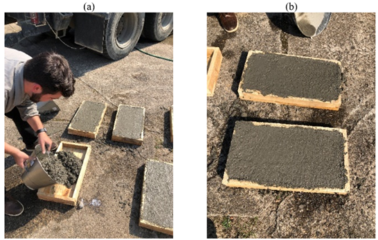 Os painéis produzidos têm dimensão de 50 x 25 x 5 cm (comprimento x largura x espessura) e para sua execução foram empregadas fôrmas de madeira com espessura de 2 cm. O concreto utilizado foi dosado em central usinado com resistência média de 10 MPa, com abatimento de 10 ± 2 cm, conforme NBR 16889:2020. O preenchimento das fôrmas foi realizado manualmente.