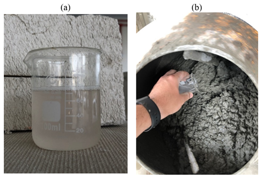 | Figura 3. Processo de mistura do cristalizante: (a) quantidade necessária de cristalizante, (b) processo de mistura na betoneira | ||||