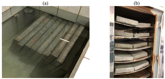 Após a execução e desforma dos painéis, que ocorreu ao terceiro dia, os painéis foram submetidos a cura submersa por um período de 28 dias. Para não ocorrer a contaminação das amostras ainda não impermeabilizadas, os painéis com impermeabilização incorporada ao concreto foram separados em diferentes tanques. Após os 28 dias de cura os painéis foram secos em estufa por 72 horas com temperatura de 40 ± 5 ºC. A Figura 4(a) apresenta os painéis durante a cura submersa e a Figura 4(b) os painéis após o processo de cura e secagem.