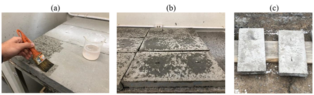 | Figura 5. Processo de aplicação do cristalizante: (a) aplicação com pincel, (b) painéis impermeabilizados, (c) painéis durante processo de cura. | ||||