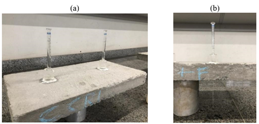 A Figura 7(a) apresenta o ensaio sendo realizado no painel com cristalizante e a Figura 7(b) o tubo de Karsten sobre a fissura de uma placa com cristalizante aplicado sobre o concreto.