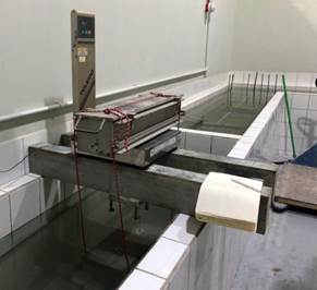O segundo ensaio realizado refere-se à determinação da absorção de água do painel e o cálculo do índice de vazios, conforme descrito pela NBR 9778:2005, utilizando-se três painéis por condição. Os painéis foram inicialmente secos em estufa à 105 ± 5 ºC por 72 horas e aferida a massa seca, posteriormente imersos em água por mais 72 horas, para sua completa saturação. Após a retirada dos painéis saturados foi realizada a pesagem com a amostra saturada e outra pesagem com auxílio da balança hidrostática, como representado na Figura 8. A partir destes valores, foi possível determinar a absorção de água, o índice de vazios, massa específica seca e massa específica saturada.