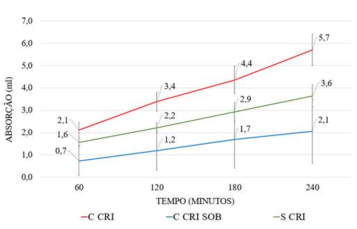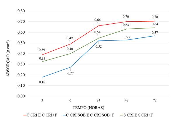 A velocidade de absorção de água mais alta dos painéis “C CRI” pode ser visualizada pela inclinação mais acentuada deste em relação a dos outros painéis, assim como, pela maior diferença entre a absorção inicial e final que foi de 171,34%, sendo que, para os painéis “C CRI SOB” foi de 200% e dos painéis “S CRI” foi de 125%.