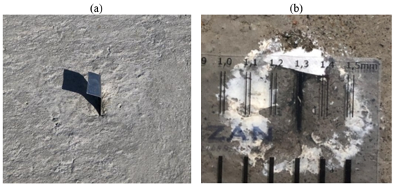 É importante mencionar que não foi possível analisar a permeabilidade, pelo método do tubo de Karsten, dos painéis “C CRI + F”, “S CRI + F” e “C CRI SOB + F”, com fissuras induzidas, devido à dimensão final da abertura da fissura, com aproximadamente 1,3 mm. Ainda assim, cabe salientar que se buscou realizar o ensaio, no entanto, dado a espessura da abertura, a água do tubo de Karsten, que foi inserido exatamente sobre a fissura, esvaía-se por completo através da fenda em segundos. A Figura 11(a) apresenta a lâmina após 48 horas da concretagem dos painéis e a Figura 11(b) a fissura após o processo de cura dos painéis.