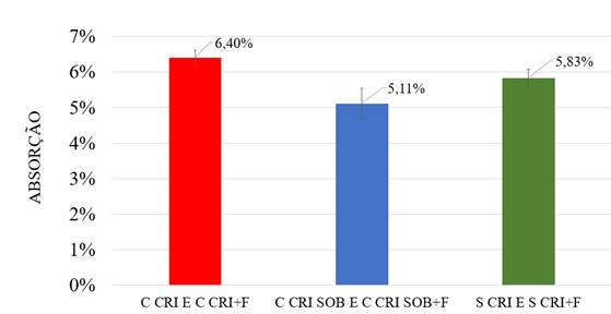 Neste ensaio os painéis “C CRI” e “C CRI+F” tiveram um a absorção de 9,38% superior aos painéis referência, já os painéis “C CRI SOB” e “C CRI SOB+F” apresentara uma diminuição de 10,94%. Também é possível observar que durante os períodos de 3 e 24 horas houve a maior absorção pelos painéis, após esses períodos as placas tiveram baixas absorções.