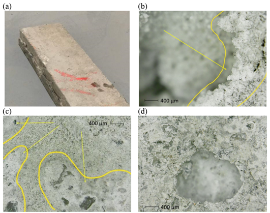 | Figura 15. Microscopia: (a) Painel cortado ao meio, (b) Painel com cristalizante misturado ao concreto, (c) Painel com o cristalizante aplicado sobre, (d) Painel de referência. | ||||