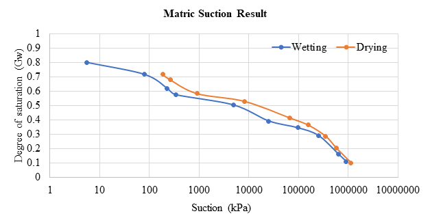 For the results of the suction of the soil, Figures 8 and 9 show the values of total suction and matric suction respectively where it can be seen that, the higher the value in the suction, the lower the moisture content in the specimen and vice versa; the higher the humidity, the lower the suction.