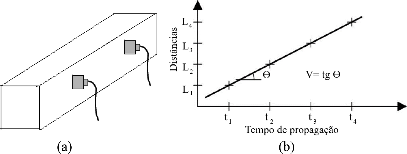 Figura 3. (a) Ensaio indireto realizado em amostras prismáticas. (b) Determinação da velocidade de propagação pelo através do método indireto. Fonte: ABNT-NBR 8802 (2019).