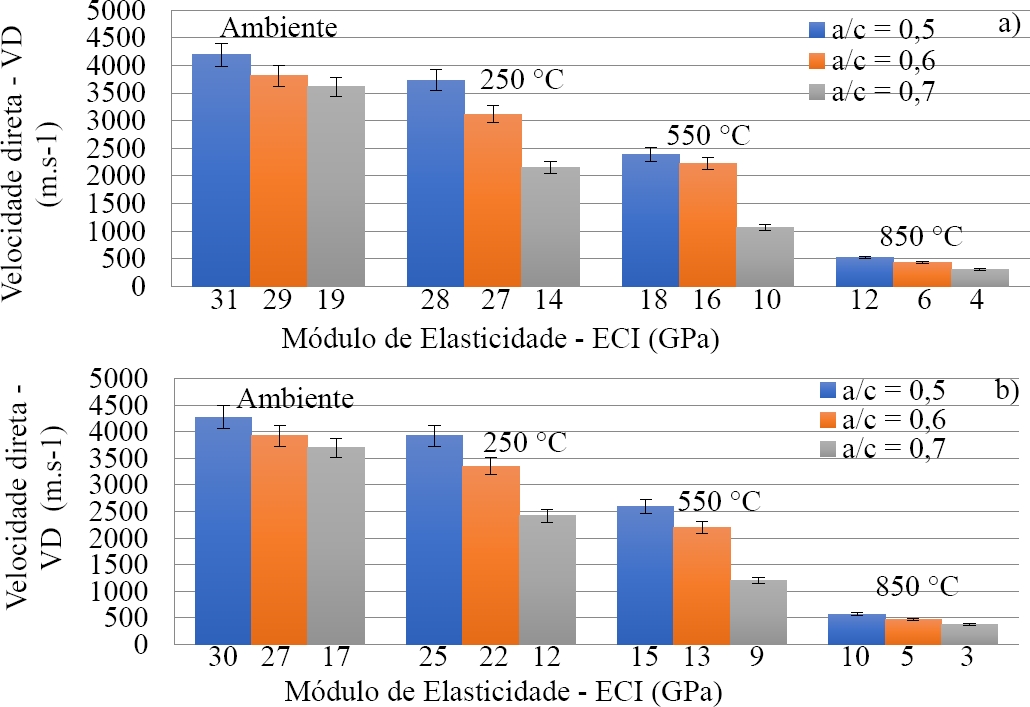 As velocidades diretas e indiretas para as amostras com fatores água-cimento (0,5 e 0,6), não obtiveram elevadas reduções para temperatura de 250˚C ambiente, em relação a ambiente, com variação (8 a 12%) para resfriamento lento, e (13 a 19%) para resfriamento brusco. A partir da temperatura de 550˚C e 850˚C é possível perceber uma acentuada redução de velocidade de propagação das ondas, para ambos os tipos de resfriamento. Entretanto as variações de velocidade direta e indireta foram elevadas, a partir de 250˚C, para o fator água-cimento (0,7), devido a maior evaporação de água no interior do concreto resultando em maior perda de massa, independentemente do tipo de resfriamento. Os valores encontrados entre as velocidades indiretas foram (30 a 37%), para os diferentes fatores água-cimento e patamares de temperatura.