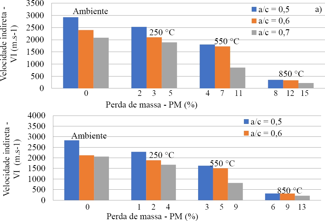 O aumento da porosidade ocasionado pela desidratação do silicato de cálcio hidratado (C-S-H), pode ser representado pelos resultados da perda de massa e velocidade direta e indireta de propagação de ondas (Figura 8 e 9), uma vez que quaisquer imperfeições no concreto, como rachaduras ou vazios contribui no aumento do tempo de propagação das ondas através do comprimento do corpo de prova, resultando em velocidades de pulso ultrassônicas mais baixas. A perda de massa ocorre de forma significativa nas amostras com fator água-cimento (0,5 e 0,6) para as temperaturas de 550˚C e 850˚C, e a partir de 250 ˚C fator água-cimento (0,7). Segundo Kirchhof et al. (2015) e Viana (2017) para temperaturas acima de 400 ˚C, o aumento da água livre nos poros do concreto acarreta o fenômeno de spalling explosivo, e maior perda de massa.