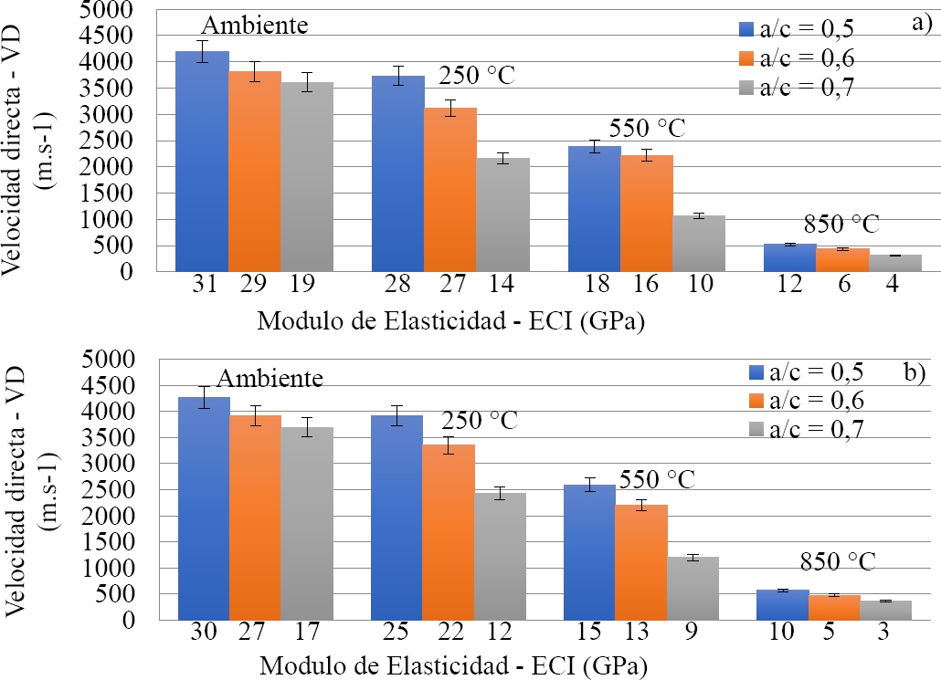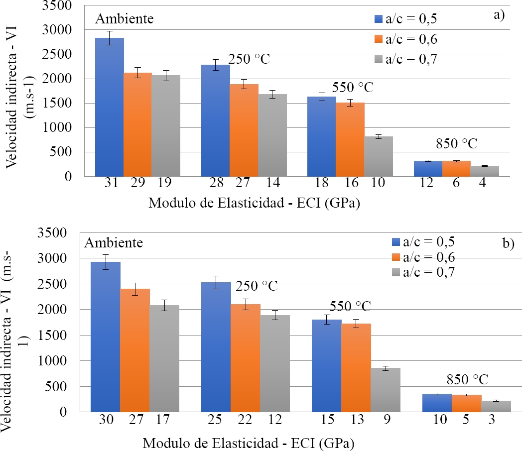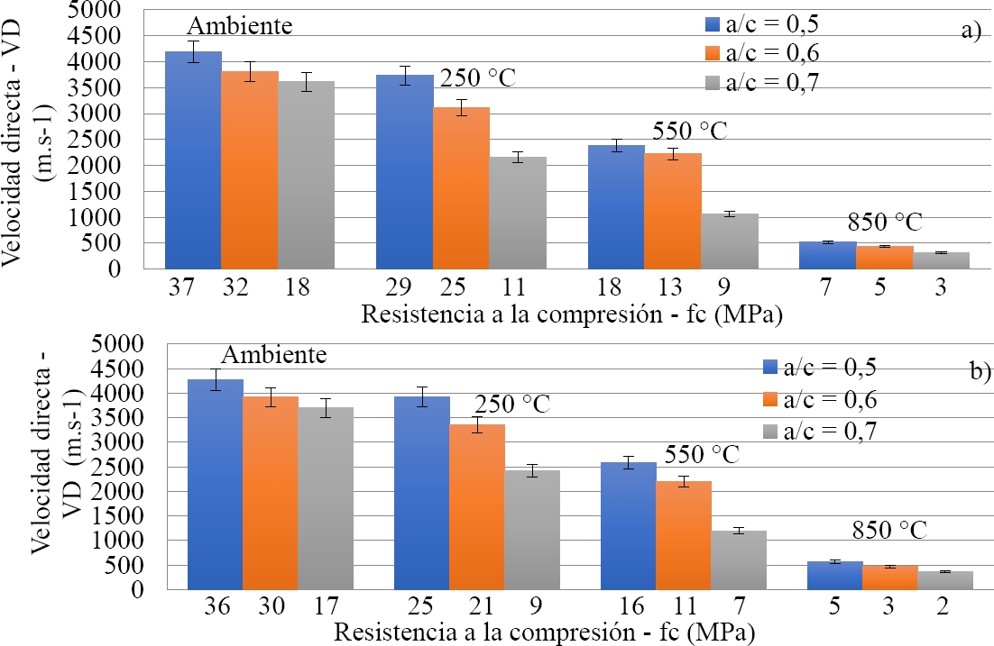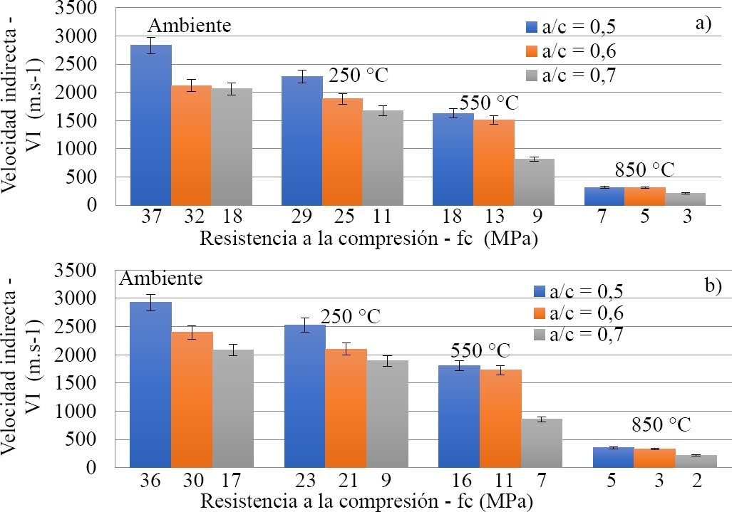 Las velocidades directa e indirecta de las muestras con factores agua-cemento (0,5 y 0,6) no mostraron grandes reducciones para la temperatura ambiente de 250˚C, con una variación de (8 a 12%) para el enfriamiento lento y de (13 a 19%) para el enfriamiento brusco. A partir de las temperaturas de 550˚C y 850˚C se observa una marcada reducción de la velocidad de propagación de las ondas para ambos tipos de enfriamiento. Sin embargo, las variaciones de velocidad directa e indirecta fueron mayores a partir de 250˚C para el factor agua-cemento (0,7), debido a una mayor evaporación del agua en el interior del hormigón que se traduce en una mayor pérdida de masa, independientemente del tipo de enfriamiento. Los valores encontrados para las velocidades indirectas fueron (30 a 37%) para los diferentes factores agua-cemento y niveles de temperatura.
