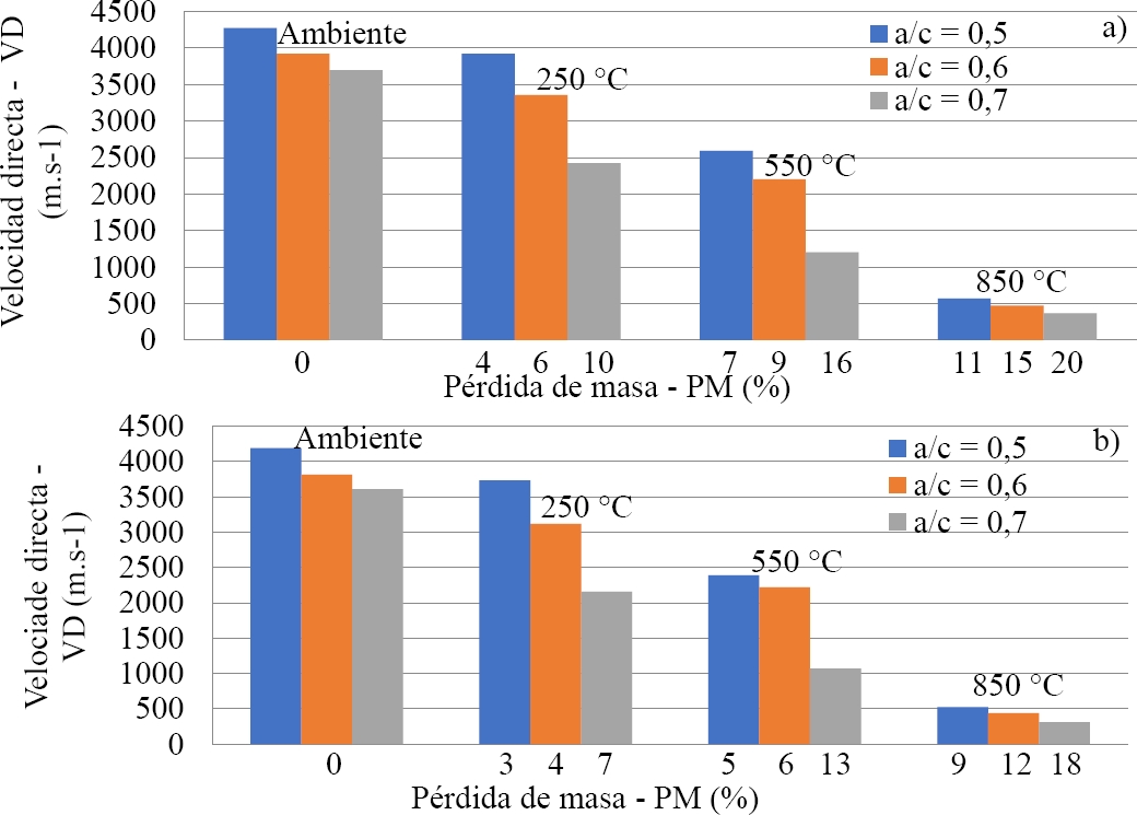 El aumento de la porosidad causado por la deshidratación del hidrato de silicato cálcico (C-S-H) puede representarse mediante los resultados de la pérdida de masa y la velocidad de propagación directa e indirecta de las ondas (figuras 8 y 9), ya que cualquier imperfección del hormigón, como grietas o huecos, contribuye a aumentar el tiempo de propagación de las ondas a través de la longitud de la probeta, lo que se traduce en menores velocidades de los impulsos ultrasónicos. La pérdida de masa se produce de forma significativa en muestras con un factor agua-cemento (0,5 y 0,6) a temperaturas de 550˚C y 850˚C, y a partir de 250 ˚C con un factor agua-cemento (0,7). Según Kirchhof et al. (2015) y Viana (2017), para temperaturas superiores a 400 ˚C, el aumento de agua libre en los poros del hormigón provoca un desconchamiento explosivo y una mayor pérdida de masa.