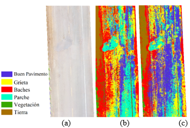 Píxeles de diferentes categorías, como buen pavimento y parches, presentaron tonalidades similares en algunas imágenes, lo que resultó en valores espectrales similares y, en consecuencia, en errores de clasificación. Se encontró que parte de los errores se produjeron por sombra y superposición de vegetación, lo que imposibilitó la clasificación de estas ubicaciones.