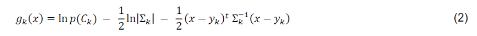 Donde g k x es la Distribuición de probabilidad normal de la clase; x: Vector de firma espectral de la imagen de píxeles; C k : Clase de cobertura del suelo k; p ( C k ) : Probabilidad de que la clase correcta sea C k ; | Σ k |: Determinante de la matriz de covarianza de datos de la clase C k ; Σ k - 1 : Inversa de la matriz de covarianza; y k : Vector de firma espectral de clase k.