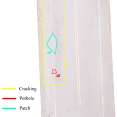 Manual classification of pavement surface pathologies was relatively quick due to the ease of identification from orthoimaging. On the other hand, after a subsequent check with the survey by walking, it was evident that the shadows of trees adjacent to the road made it difficult to visualize some pathologies and their extent, mainly cracks. In addition, vegetation hid parts of the pavement.