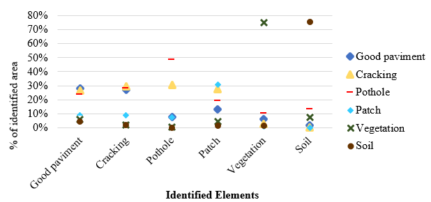 Fig. 6 shows that the land and vegetation classes presented better results, with percentages of correct answers more significant than 60 and 70%, respectively. Good pavement, cracks, and patches presented values between 30 and 50%, understood as a bad result. The pans present the worst result, with a hit of approximately 25% and a higher number of areas erroneously classified as patches.