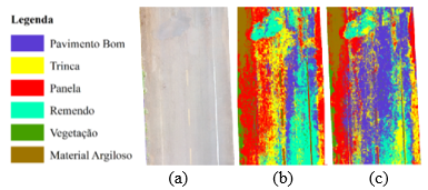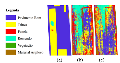 Com o auxílio do QGIS, sobrepuseram-se os polígonos obtidos na classificação manual aos polígonos da classificação supervisionada provenientes da transformação da imagem raster em polígonos. Assim, obteve-se a área em comum de ambas as classificações para cada elemento. A fim de verificar a porcentagem de acerto de identificação de patologias, os resultados da classificação manual foram confrontados com os da classificação supervisionada a partir de 24 e 48 amostras. A título de exemplo, na Figura 3 é exibido um mesmo trecho classificado de forma manual (a) e supervisionada, com 24 amostras (b) e 48 amostras (c).