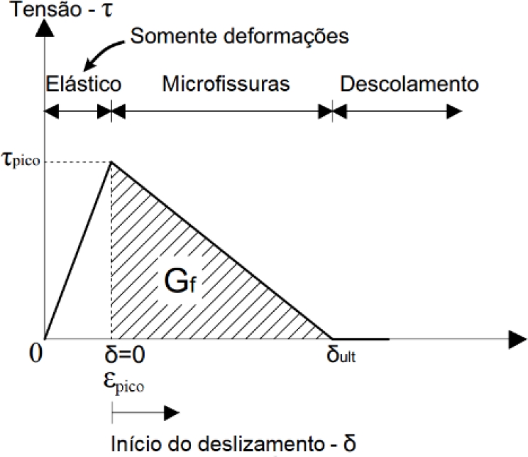 Segundo Camanho e Dávila (2002), a simulação do descolamento é, geralmente, dividida entre deformação inicial e a propagação do descolamento. A tensão de cisalhamento da ligação aumenta linearmente com a deformação da interface até que atinge o pico de tensão () e, consequentemente, o início do deslizamento interfacial. A partir desse ponto, ocorre o início da danificação do material caracterizado por um decréscimo do módulo de elasticidade (Figura 3), também chamado de amolecimento interfacial (ou surgimento de microfissuras). Quando a tensão reduz a zero, tem-se o valor do máximo deslizamento suportado pelo sistema () e, a partir desse ponto, não é mais possível transferir tensões entre os substratos, caracterizado como descolamento.
