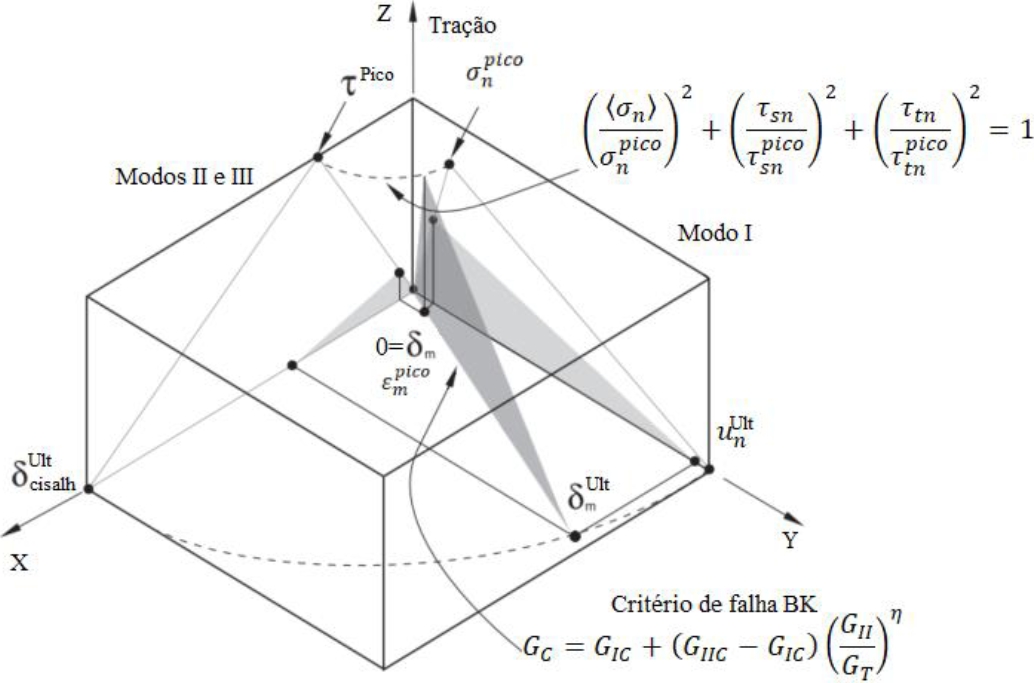 Foi apresentado na Figura 3 o modo de falha II caracterizado pelo deslizamento do material em uma superfície. Em situações de vigas reforçadas ao cisalhamento, diferentes modos de falha podem ocorrer além do descrito anteriormente, o que caracteriza o surgimento do modo misto de falha. Esse modo representa a lei constitutiva como uma combinação dos modos individuais (Modos I, II e III). Os modos II e III representam o modelo visto anteriormente e é representado pelos subscritos e , respectivamente, onde poderão ser vistos na Figura 4. O modo I é a aplicação de carregamento normal à superfície coesiva representado pelo subscrito . O comportamento elástico linear para elementos 3D nos modos puros I, II ou III, exceto para , pode ser expresso pela Equação (4).