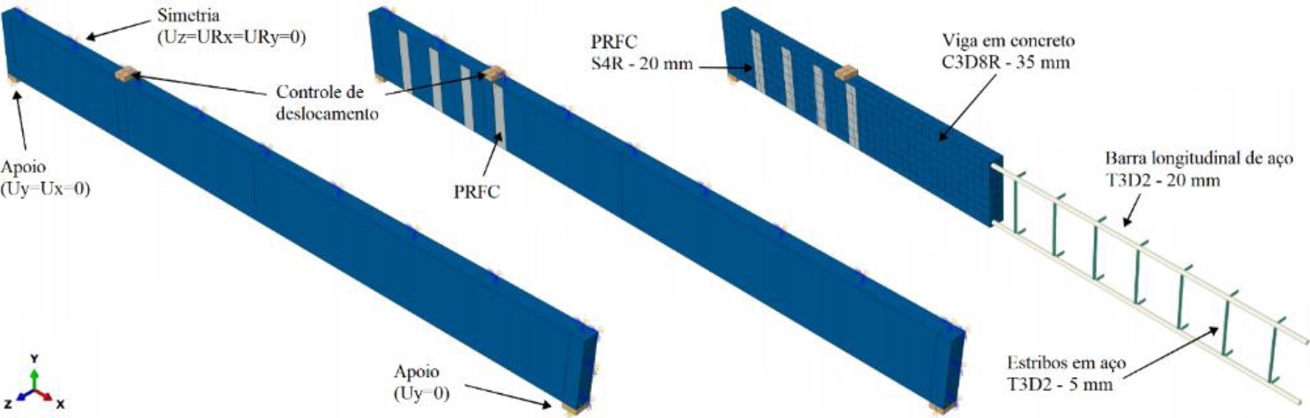 Para a modelagem da viga em concreto, decidiu-se pela utilização de um modelo geométrico tridimensional formado por elementos sólidos (Solid). O tipo de elemento usado para o concreto é o C3D8R (elemento sólido quadrangular com 8 nós de integração reduzida) com uma malha de 35 mm (1036 elementos). O modelo numérico usado foi o CDP. O elemento tridimensional de barra disponível no software é definido como Wire e foi utilizado para representar a armadura em aço. Esses serão do tipo Truss, denominados por T3D2 (2 nós). O tamanho da malha para a armadura longitudinal foi de 20 mm (260 elementos) e 5 mm para os estribos (930 elementos). A função embedded region foi adotada como metodologia da interação entre o aço e o concreto. O reforço externo foi modelado como elemento de casca fina (Shell). O tipo adotado foi o S4R (quadrangular com 4 nós de integração reduzida) e uma malha de 20 mm (156 elementos). A interface em adesivo químico foi simulada como superfície coesiva. A carga aplicada foi em forma de deslocamento. Por apresentar simetria em um plano, a modelagem procedeu com a aplicação dessa característica na viga. A estratégia de simulação adotada foi a de Newton - Raphson. Essas características são representadas pela Figura 6.