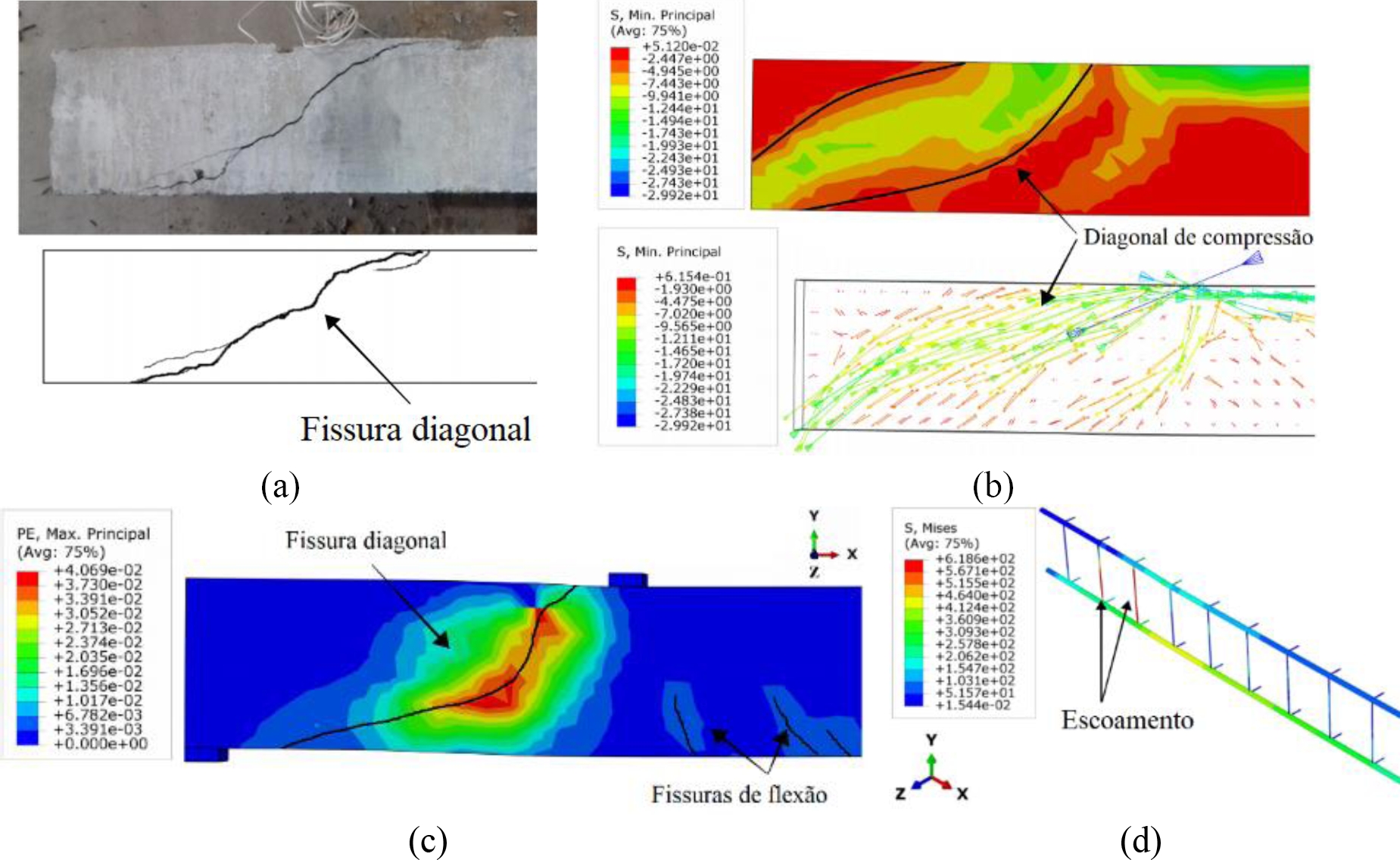 A viga referência foi a ruptura após o desenvolvimento da fissura diagonal, compreendida entre o ponto de aplicação de carga e o apoio. Pela Figura 8b, pode ser observada a formação da diagonal de compressão no vão de cisalhamento. A fissura crítica experimental também foi vista nos resultados numéricos, como na Figura 8c, acompanhada de algumas fissuras de flexão. Resultados semelhantes foram observados em outros estudos (Al-Osta et al., 2017; Demin e Fukang, 2017; Jumaa e Yousif, 2019; Arcine, Menon e Krahl, 2023).