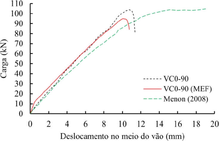 A Figura 9 apresenta resultados numéricos e experimentais da viga reforçada ao cisalhamento com PRFC (VC0-90), assim como resultados experimentais de Menon (2008). Nota-se uma boa concordância entre os resultados. O teste numérico VC0-90 (MEF) e o experimental VC0-90 apresentaram um descarregamento na região pós-pico, o que caracteriza a falha da superfície coesiva, ou no caso experimental, o descolamento do reforço e o colapso subsequente ao cisalhamento. Foi possível afirmar que o reforço ao cisalhamento dessas vigas aumentou significativamente a sua ductilidade, com um aumento de resistência de aproximadamente 18%. Em relação a carga de pico, a viga experimental VC0-90 alcançou uma carga de 102,5 kN, enquanto a simulada VC0-90 (FEM) atingiu 94,9 kN, um erro relativo de 7,41%. Esse comportamento mostra que a viga simulada apresentou um descolamento prematuro antes da viga experimental. Isso pode ser atribuído aos dados adotados segundo Obaidat, Dahlblom e Heiden (2010), pois para obter resultados mais precisos, há a necessidade de testes experimentais que melhor descrevem o material usado experimentalmente. Apesar disso, os houve pouca discrepância de comportamento e o resultado foi considerado satisfatório.
