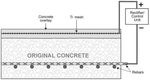 The corrosion protection is providing by placing an anode, made from Titanium mesh for example, at the surface of the concrete and connected directly to the reinforcement network (refer to the figure 12).