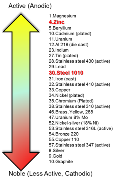 Galvanic corrosion protection of steel in concrete is based on the formation of a galvanic element if a metal less noble than steel (refer to the figure 13), in direct contact with the concrete overlay, is electrically connected to the steel reinforcement bars. The reinforcing steel is protected from corrosion as long as sufficient galvanic current flows between the galvanic element (acting as anode) and the steel reinforcement (acting as cathode). Most commonly, zinc is used as the sacrificial element / anode material. The galvanic cell that is formed corresponds to a conventional zinc/air battery. The first known application of a galvanic corrosion protection system for reinforced concrete, was on a bridge deck in Illinois in 1977.