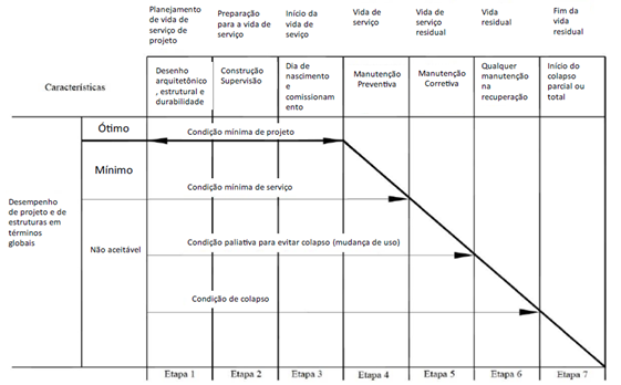 | Figura 6. Modelo esquemático de vida útil em 7 estágios (Castro e Helene, 2007). | ||||