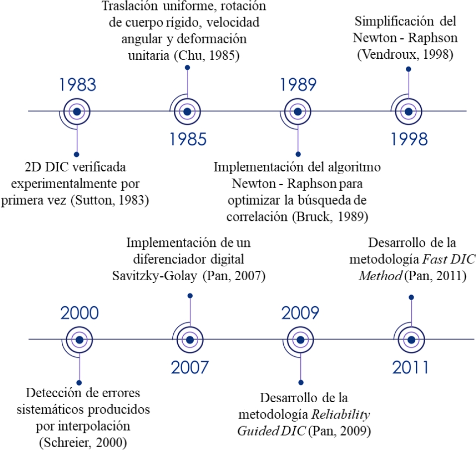 El desarrollo de la técnica de DIC ha ocurrido desde su origen en los años 80 y ha estado en constante cambio y evolución con el objetivo de reducir el costo computacional y aumentar su aplicabilidad.