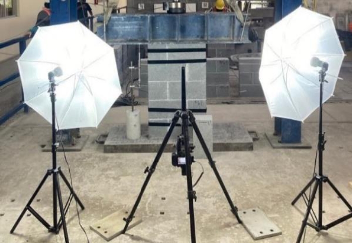 4) Captura de imágenes. Para la captura de imágenes se empleó una Cámara NIKON D5600 lentes 18mm a 58 mm de 24 MPX con control remoto y un trípode marca Manfrotto. Además, se emplearon dos fuentes de luz marca GTC luz fría 3900 lm con paraguas fotográfico, como se aprecia en la Figura 4. La captura de imágenes se realizó mientras se ensayaban los muretes a compresión axial.