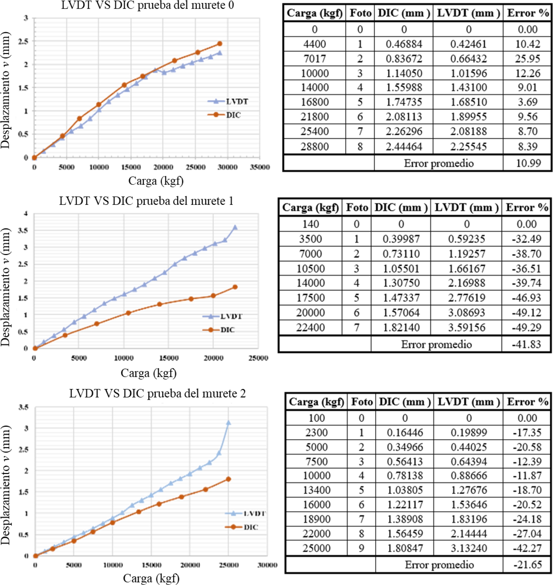 Figura 7. Resultados de la comparación entre el LVDT y el DIC para los muretes 0, 1 y 2.