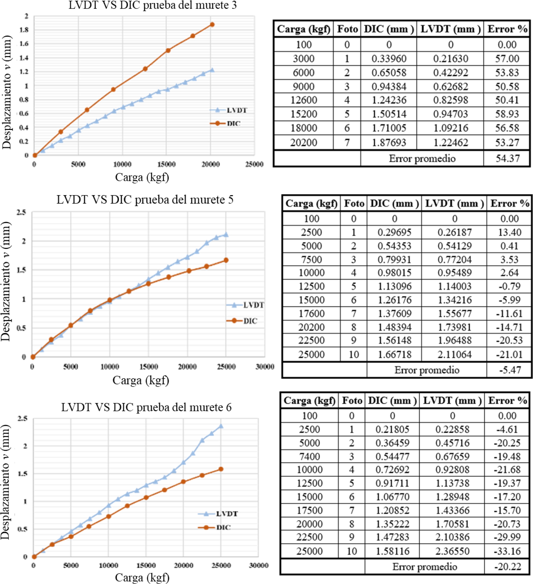 Figura 8. Resultados de la comparación entre el LVDT y el DIC para los muretes 3, 5 y 6.