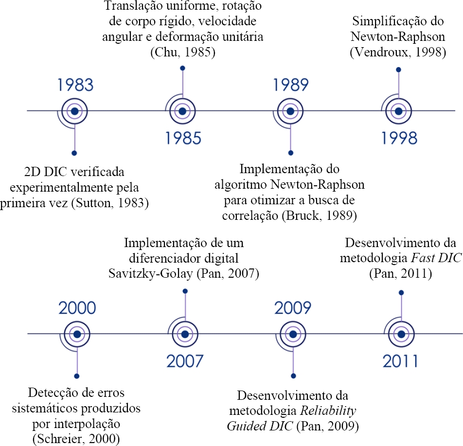 A Figura 1 apresenta a evolução de sua implementação em uma linha do tempo. Porém, a partir de 2010 (Destrebecq et al., 2011), sua implementação iniciou-se em alguns problemas de engenharia civil como: vigas de concreto armado, paredes de alvenaria (Mojsilović e Salmanpour, 2016) , entre outros (Bruck et al., 1989; Chu et al., 1985; Pan, 2009; Pan and Li, 2011; Schreier et al., 2009; Schreier et al., 2000; Vendroux and Knauss, 1998).