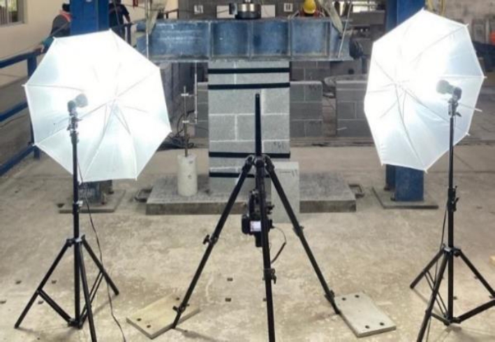 4) Captura de imagens. Para a captura das imagens foi utilizada uma câmera NIKON D5600 lentes de 18mm a 58 mm de 24 MPX com controle remoto e um tripé Manfrotto. Além disso, foram utilizadas duas fontes de luz da marca GTC, luz fria 3900 lm, com guarda-chuvas fotográficos, conforme Figura 4. A captura da imagem foi realizada enquanto as paredes eram ensaiadas sob compressão axial.