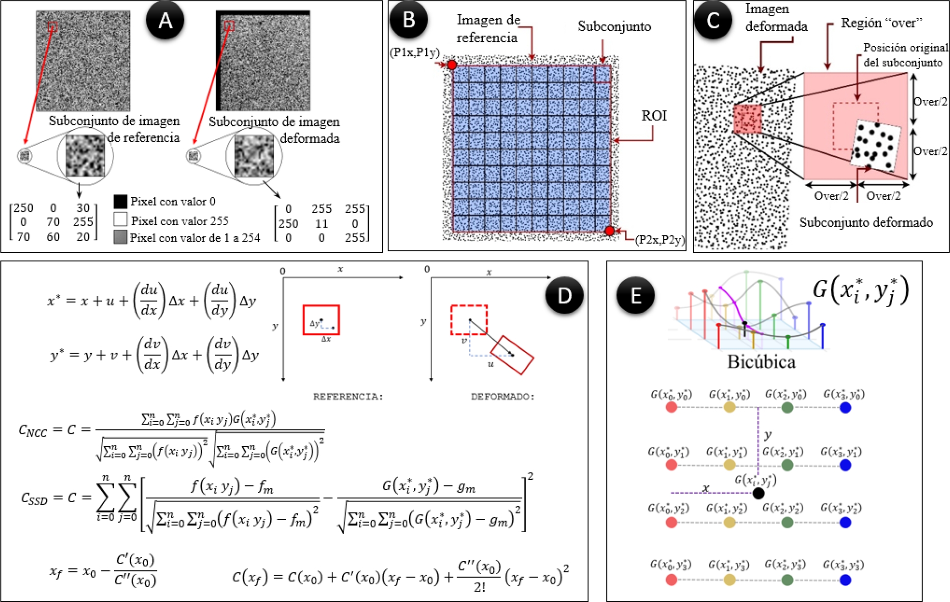 A Figura Figura 6implementação do algoritmo utilizado para aplicação da técnica DIC neste trabalho. Primeiramente, um subconjunto do padrão de pontos foi obtido na imagem de referência e o mesmo subconjunto na imagem deformada após o teste ( Figura 6A). Os subconjuntos foram classificados em pixels na seguinte escala de cinza: 0 (preto) a 255 (branco). Posteriormente, os subconjuntos foram subdivididos de forma otimizada, selecionando a região de referência conhecida como “região de interesse” (Region Of Interest, ROI por suas siglas em inglês) (Figura 6B). Uma vez definidos os subconjuntos dentro da ROI, a posição de pesquisa dentro da imagem distorcida é determinada. Isto é feito definindo uma distância arbitrária “over”, que depende das deformações máximas esperadas (Figura 6C). Na Figura Figura 6D mostram-se as equações que foram utilizadas para determinar as coordenadas dos pontos deformados a partir dos deslocamentos horizontal (u) e vertical (v). Para isso foram utilizadas as funções de interpolação no estado indeformado e deformado . Para calcular os coeficientes de correlação, foram utilizados o critério de Correlação Cruzada Normalizada ( e Diferenças ao Quadrado de Soma Zero ( (Pan et al., 2010). A busca por valores extremos de correlação é feita pelo método de Newton Raphson (Steven e Raymond, 2015) . Para obtenção das funções de interpolação ' f', ' G' e 'C' foi utilizado o critério de interpolação bicúbica (Figura 6E), uma vez que a demanda computacional é relativamente baixa se comparada a outros métodos de interpolação (Schreier et al., 2000) .