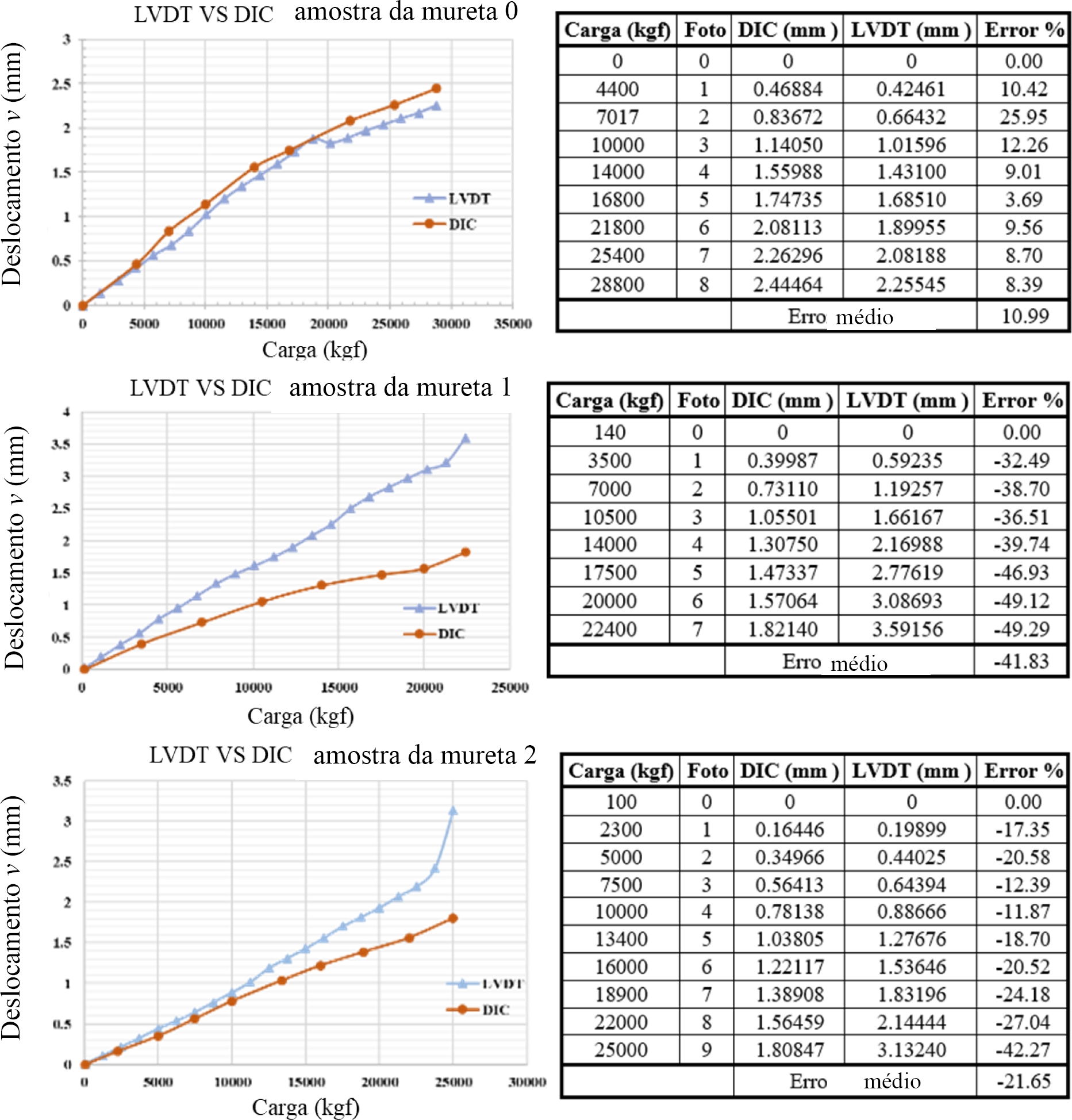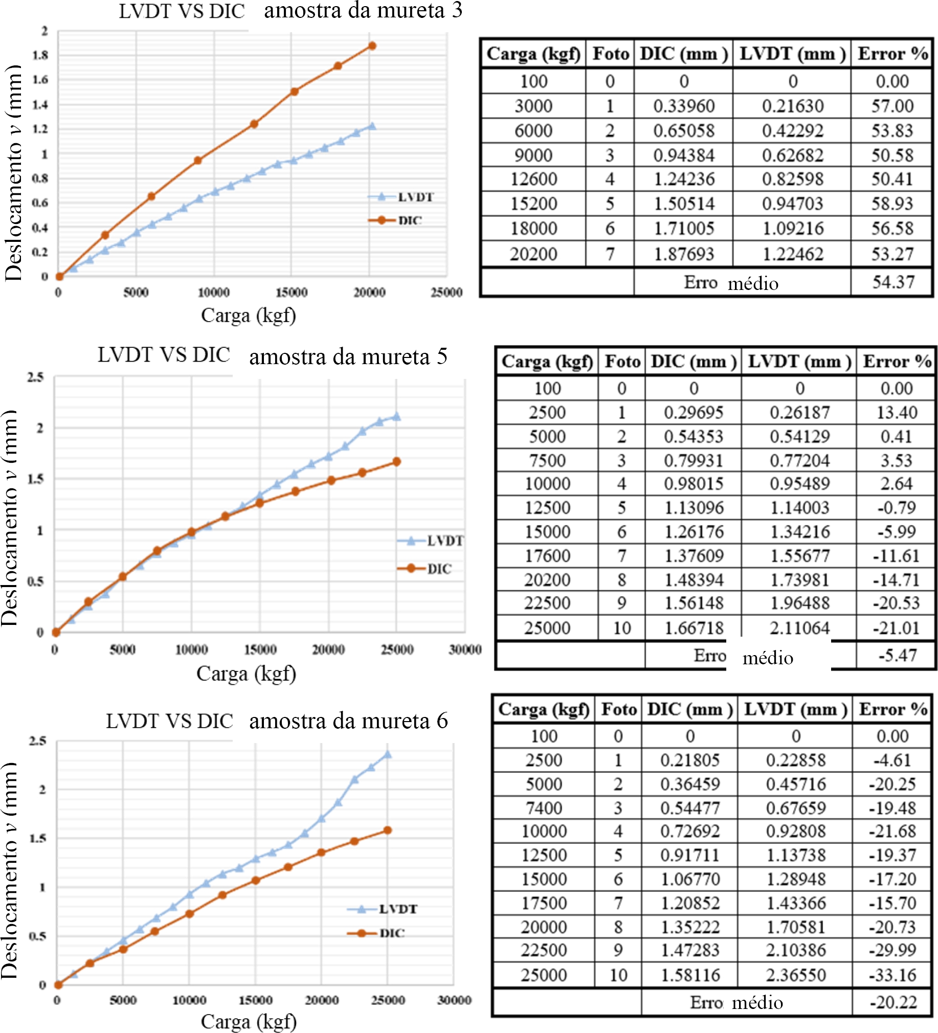 Ao comparar os deslocamentos verticais entre as técnicas DIC e LVDT, constatou-se que estas apresentam grandes erros relativos, sendo a média máxima de 54,37% no teste da parede 3. Isso se deve a fatores como: distorção da lente, movimentos indesejados e aparecimento de fissuras ou descontinuidades no meio.