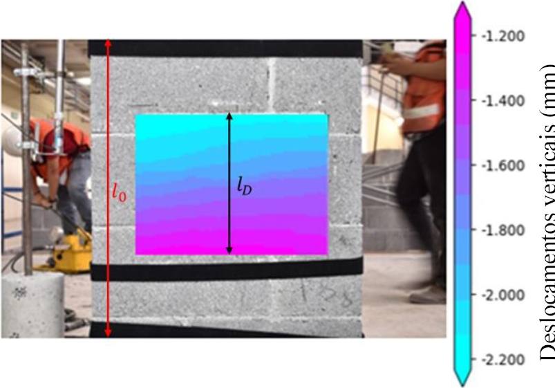 Na Figura 9, os resultados referentes aos deslocamentos verticais para a parede do ensaio 5 podem ser observados na foto tirada momentos antes da ruptura, com carga máxima de 25.000 kgf. Esses deslocamentos foram obtidos em todo o domínio medido com a aplicação da técnica DIC.