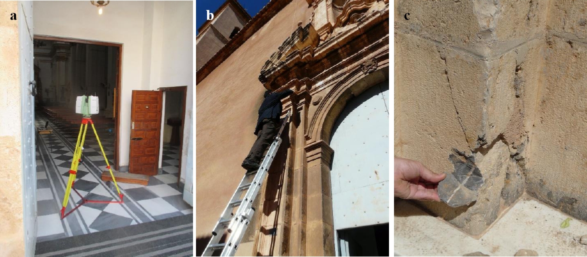 The collection of documentary data has been carried out especially in the parish archive and the Serrano y Valderrama architecture office in Elche, where the studies and project of the architect Antonio Serrano Peral, who worked on the church in the mid-20th century and was the author of the drawing in Figure 3, are kept. Mainly cracks in the interior and facades of the building caused by the excavations carried out inside the church. The damage to the doorway is not described, although the wall that supports it has a crack next to it on the right-hand side, probably due to the same cause as the cracks in the interior. Figure 3b) shows that there is a hollow area next to the facade containing the doorway, which corroborates the origin of the fracture.