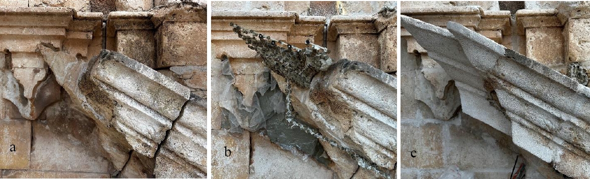 Figure 12. Different aspects of the restitution of volume using mortar with lightened core and light mortar. a) Missing area already consolidated while waiting to drill holes for anchoring. b) Appearance of the lightened core prepared to add mortar externally. c) Appearance with mortar already reintegrated, pending the application of glazing with lime water and pigments to blend the added area with the rest of the facade.