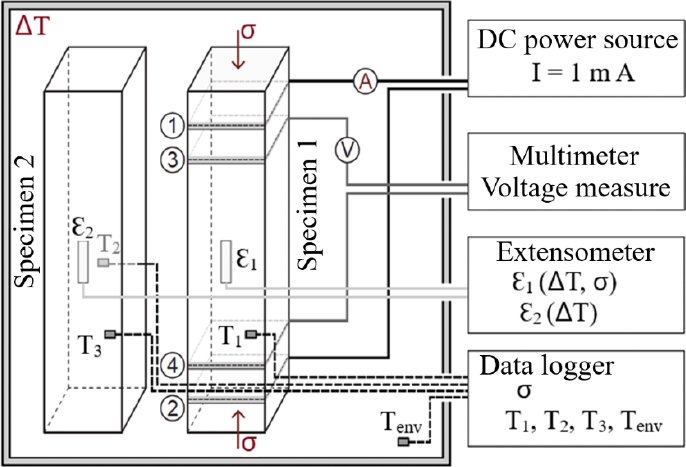 The electrodes thus fixed constitute the electrical connections for the application of a predefined electric current between the outer points ① and ② while recording the potential difference measured between the inner points ③ and ④. The electric current was applied using a Keithley 6220 digital source from National Instruments Inc. The potential difference was measured with a Keithley 2002 digital multimeter from National Instruments Inc. The 10 mm strain gauges (model 10/120 CLY41-4L-3M, supplied by HBM) were used to record the deformations caused by both the stress and the temperature increase during the test.