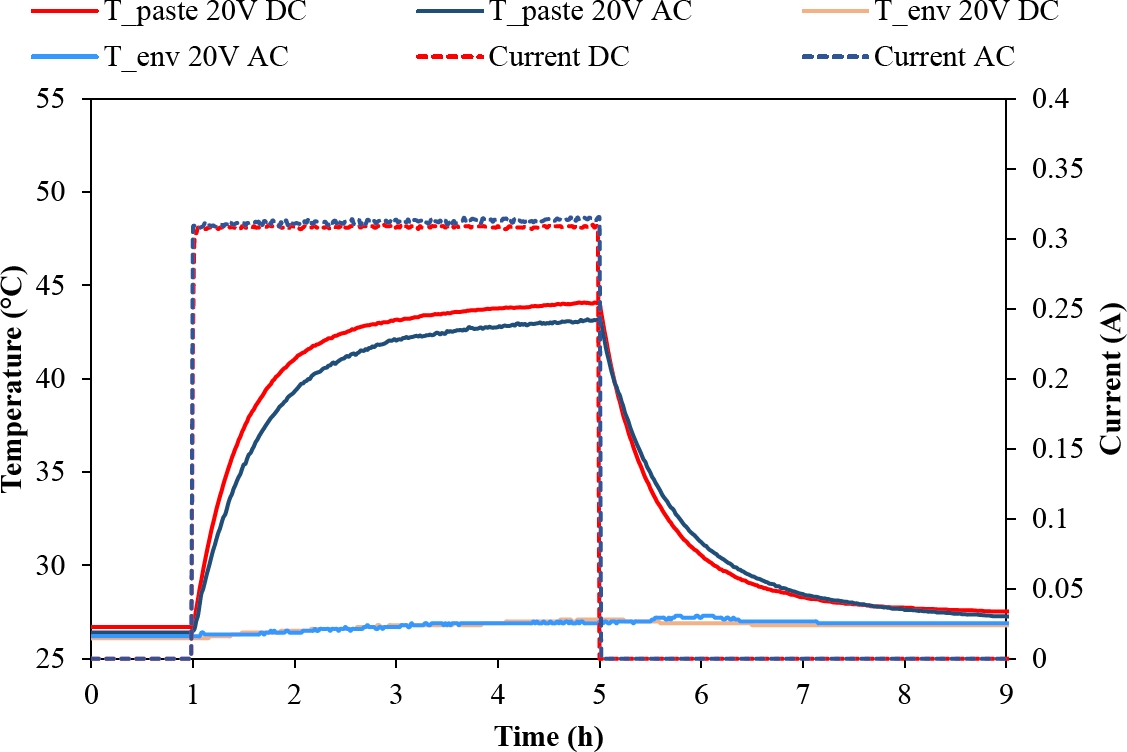 Figure 5. Ambient temperature (T env), specimen´s average temperature (T paste), both in °C, and monitored current (dashed lines), in A, versus time (in hours), for heating tests of cement paste in AC and DC with a fixed voltage of 20 V.